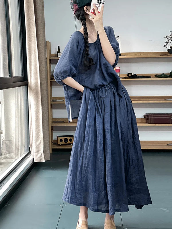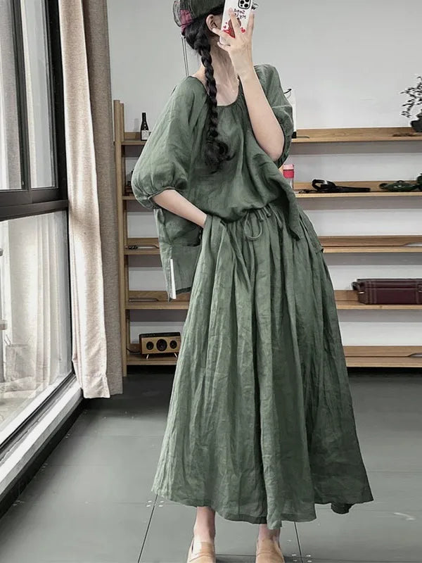 Fashionable Cotton Linen Two-Piece Set β Lantern Sleeve Top & Elastic Waist Midi Skirt for Women