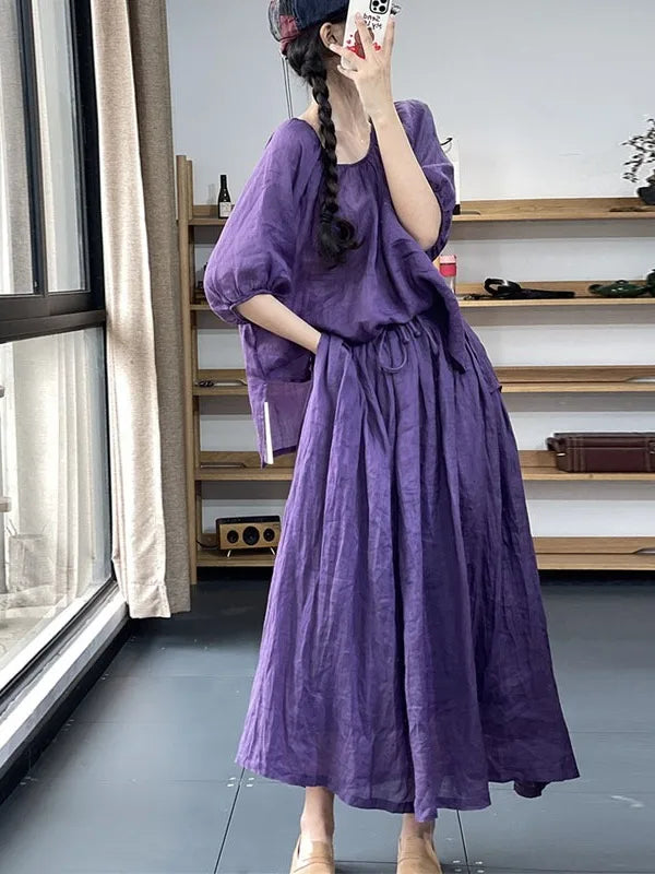 Elevate your wardrobe with this womenβs cotton linen two-piece set, designed for style, comfort, and versatility. The set includes a round neck lantern sleeve T-shirt and an elastic waist midi skirt, making it the perfect choice for both casual days and elegant evenings.