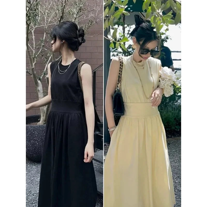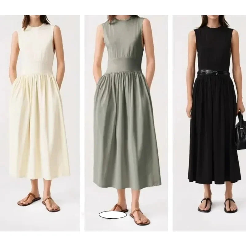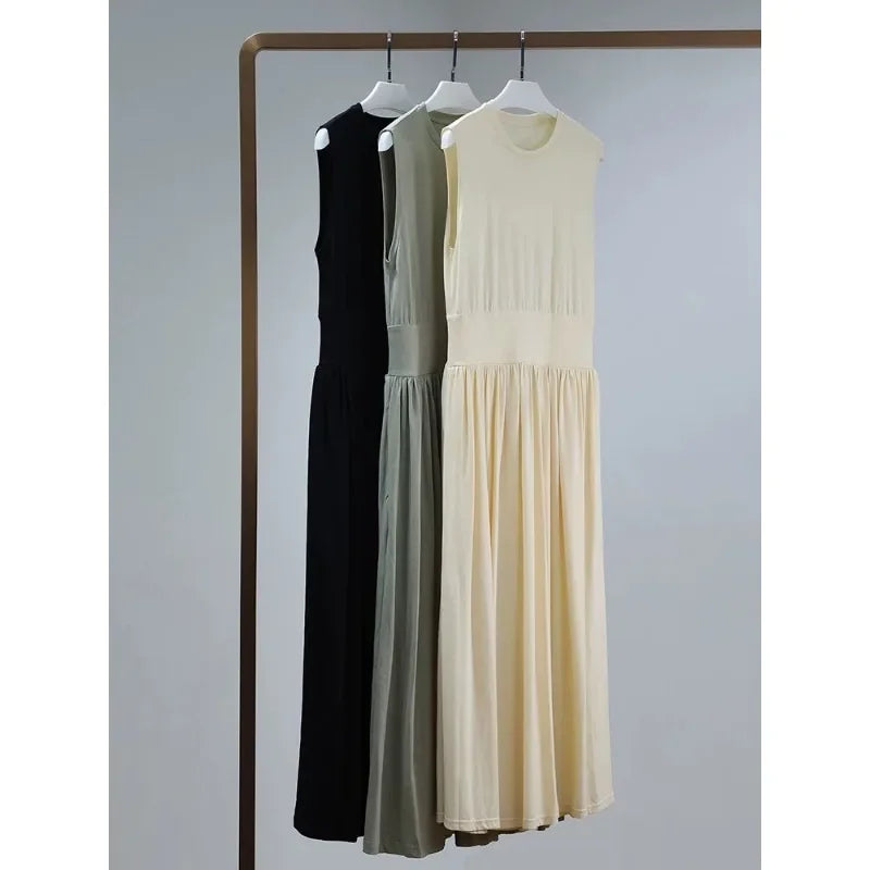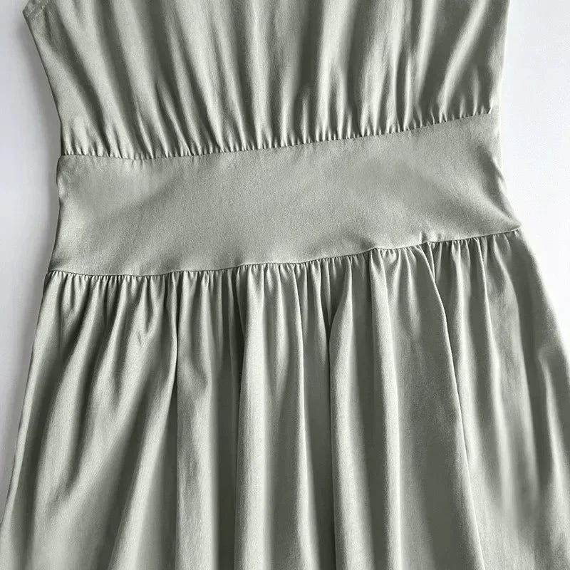 Luxury Sage Green Organic Cotton Tank Top Dress – Pleated Pocket, Waist Wrap, Swing Skirt, Long Dress